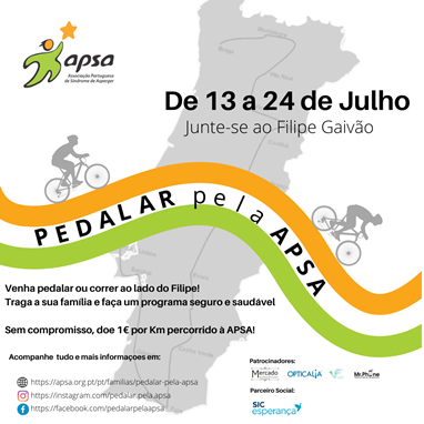 O ciclista Filipe Gaivão junta-se à Associação Portuguesa de Síndrome de Asperger (APSA) através do desafio que o vai pôr a pedalar pelo país, em prol das pessoas com Síndrome de Asperger. A APSA vai acompanhar o ciclista em algumas etapas, onde apresentará, também, sessões de sensibilização sobre a síndrome de asperger e de atendimento às famílias.